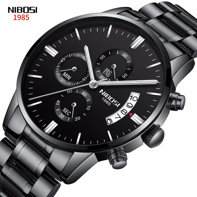 Часы наручные NIBOSI мужские с хронографом, брендовые Роскошные Кварцевые, из нержавеющей стали, чёрные