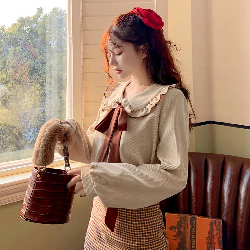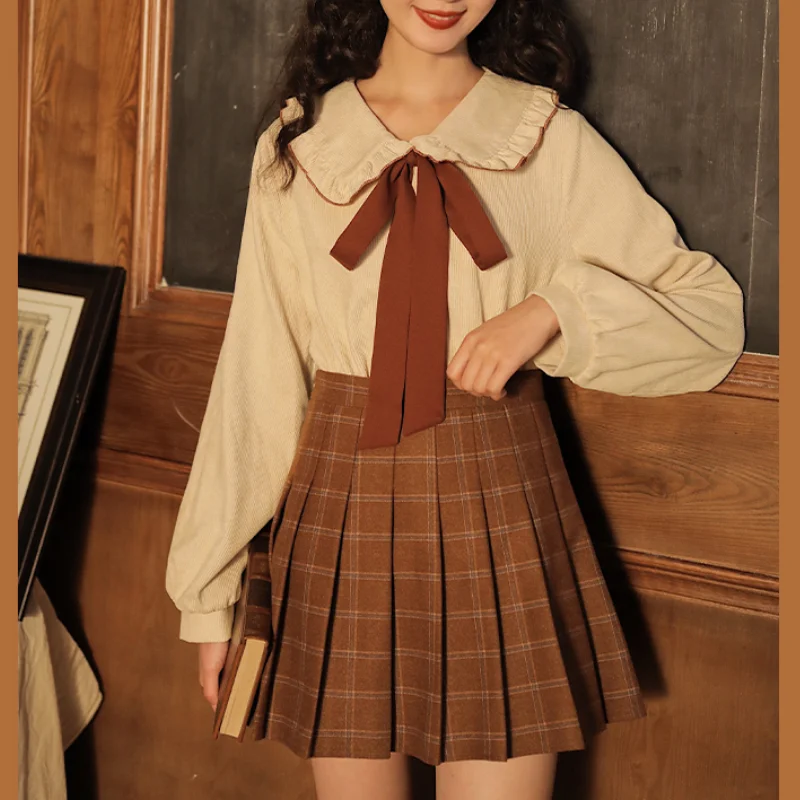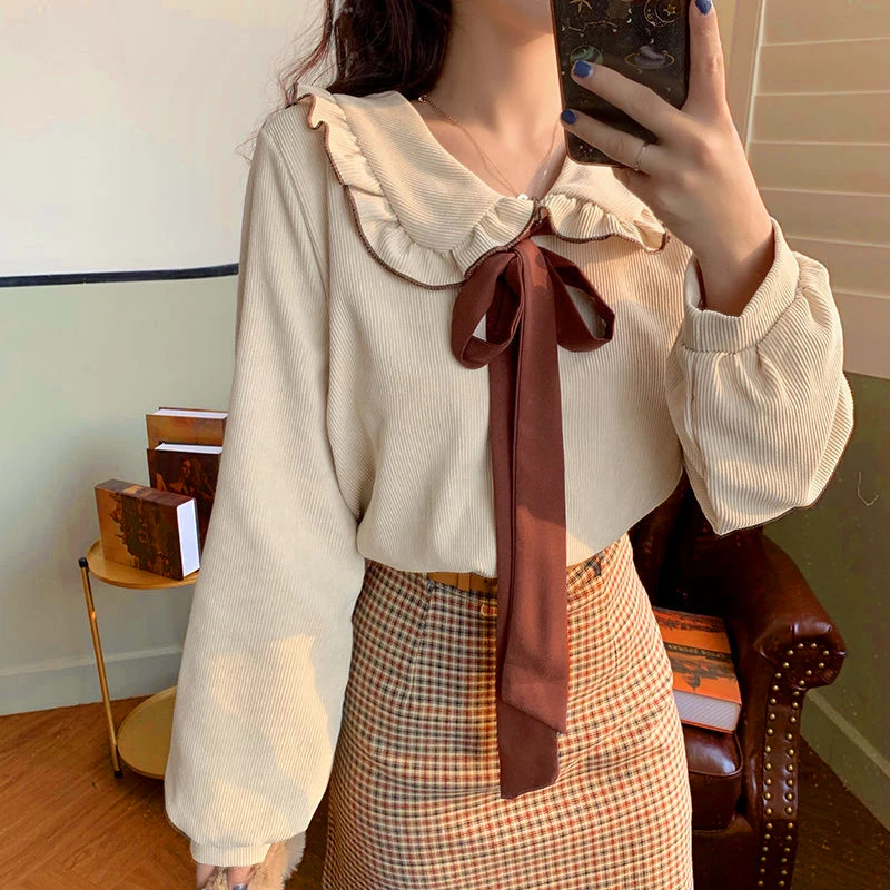 Вельветовые рубашки Kawaii, женская блузка с бантом и воротником Питера Пэна для подростков, осенняя форма 2021 года, одежда на пуговицах с длинными рукавами
