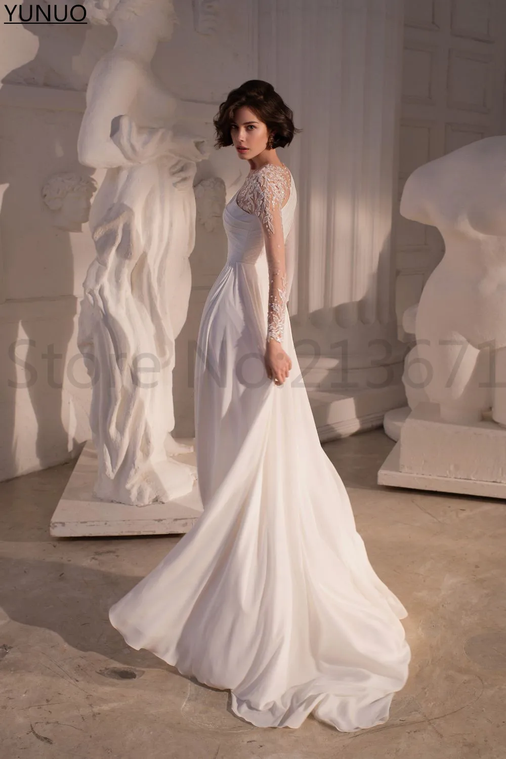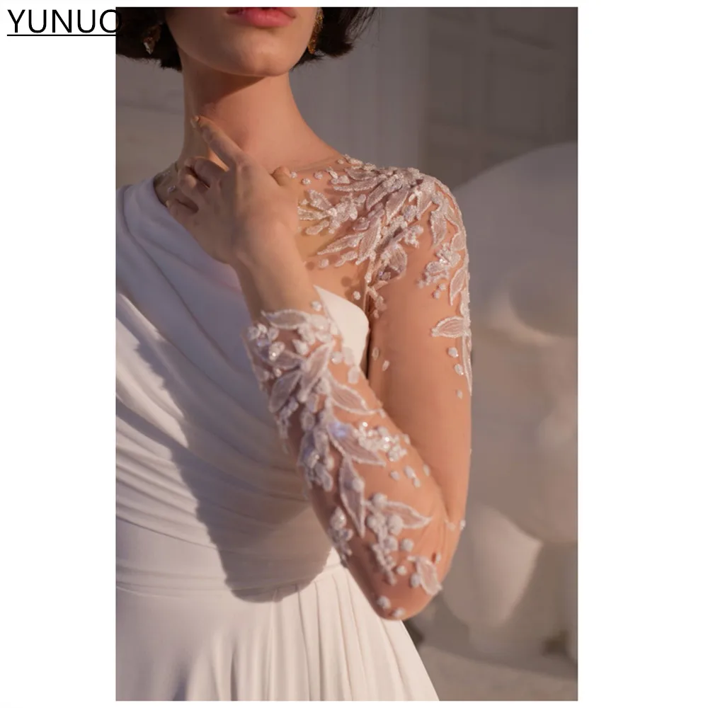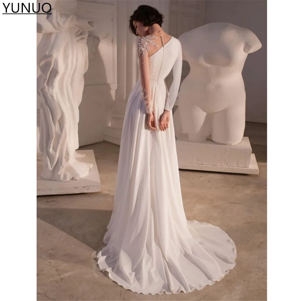Элегантное шифоновое пляжное свадебное платье YUNUO трапециевидной формы с длинными рукавами и вырезом сбоку Свадебные платья с жемчугом vestido de noiva