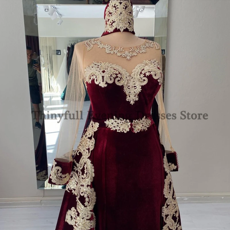 Thinyfull бордовое марокканское кафтановое вечернее платье 2021 Дубай Саудовская версия с вышивкой велюр с длинным рукавом исламское платье для выпускного вечера