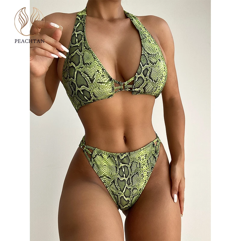 Peachtan, бикини с лямкой через шею, 2021, купальник с принтом змеиной кожи, женский купальник с высоким вырезом, женский купальный костюм, сексуальный купальный костюм, бикини на лето