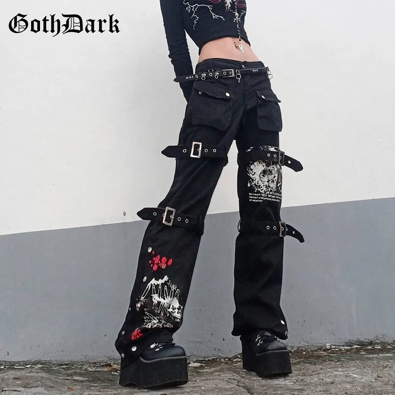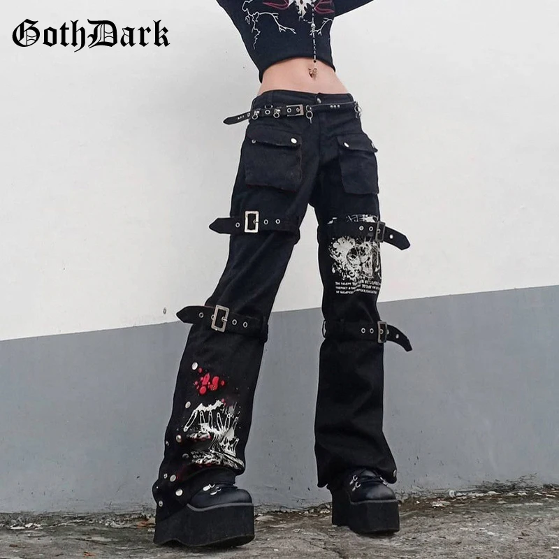 Goth Dark, панк, гранж, готический стиль, пэчворк, черные карго джинсы, эмо, эстетическая Женская Осенняя одежда, брюки Harajuku, с принтом, уличная одежда