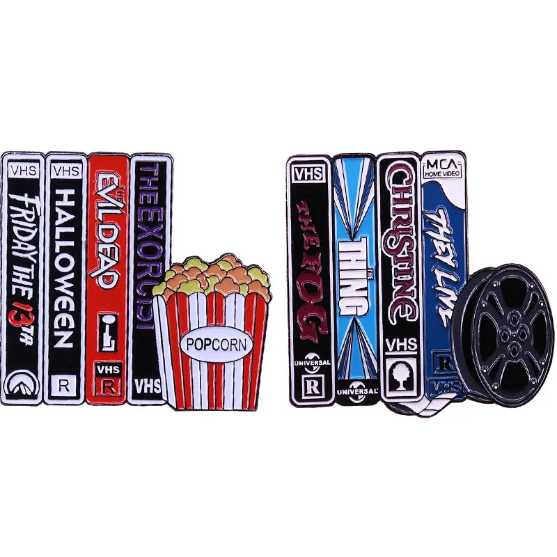 Эмалированная брошь в виде фильма ужасов VHS and Chill попкорн, металлические значки, заколка на лацкан, броши на куртки, джинсы, модные украшения, аксессуары