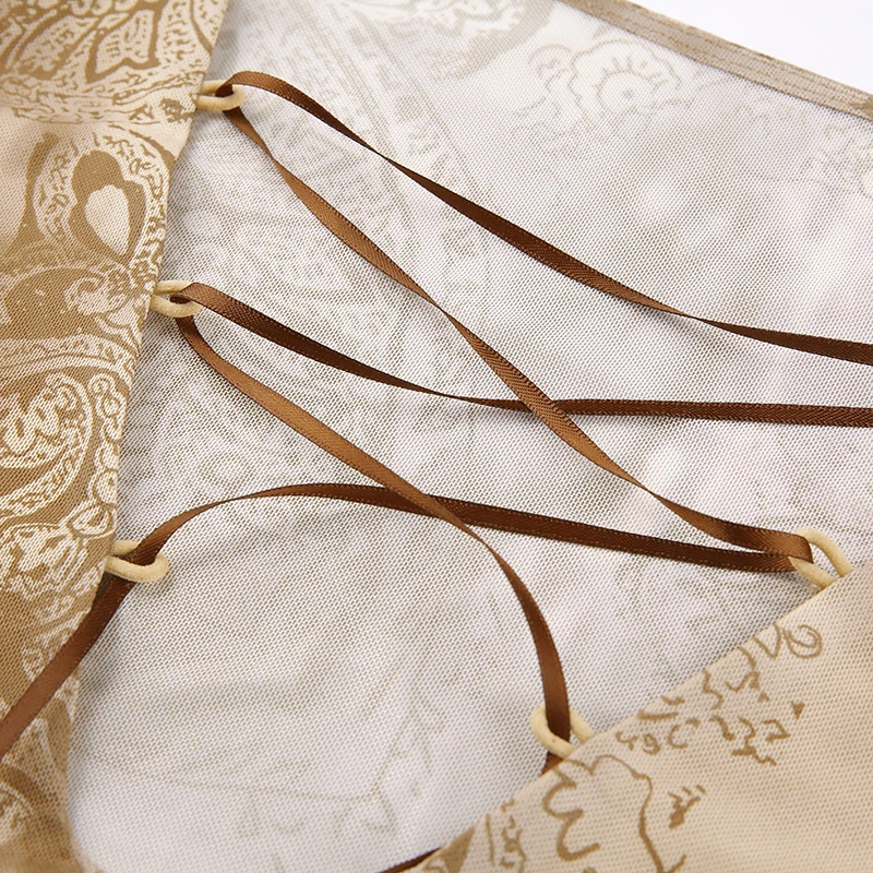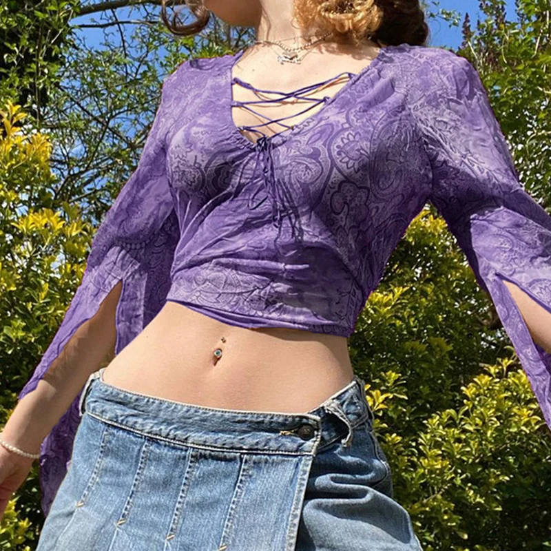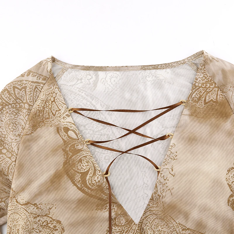Женская Сетчатая футболка с рукавами-фонариками, V-образным вырезом и винтажным принтом