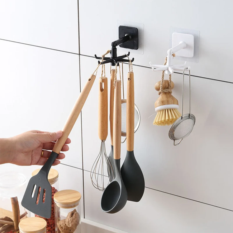 Настенный крючок с поворотом на 360 , смонтированный Органайзер крючков, вешалка для ложек без отверстий, кухонные аксессуары для хранения