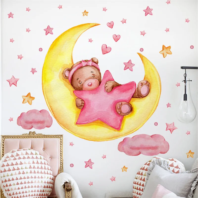Милая мишка тедди, Спящая на Луне Наклейка на стену s для детской комнаты, украшение детской комнаты, искусственная наклейка из ПВХ для интерьера