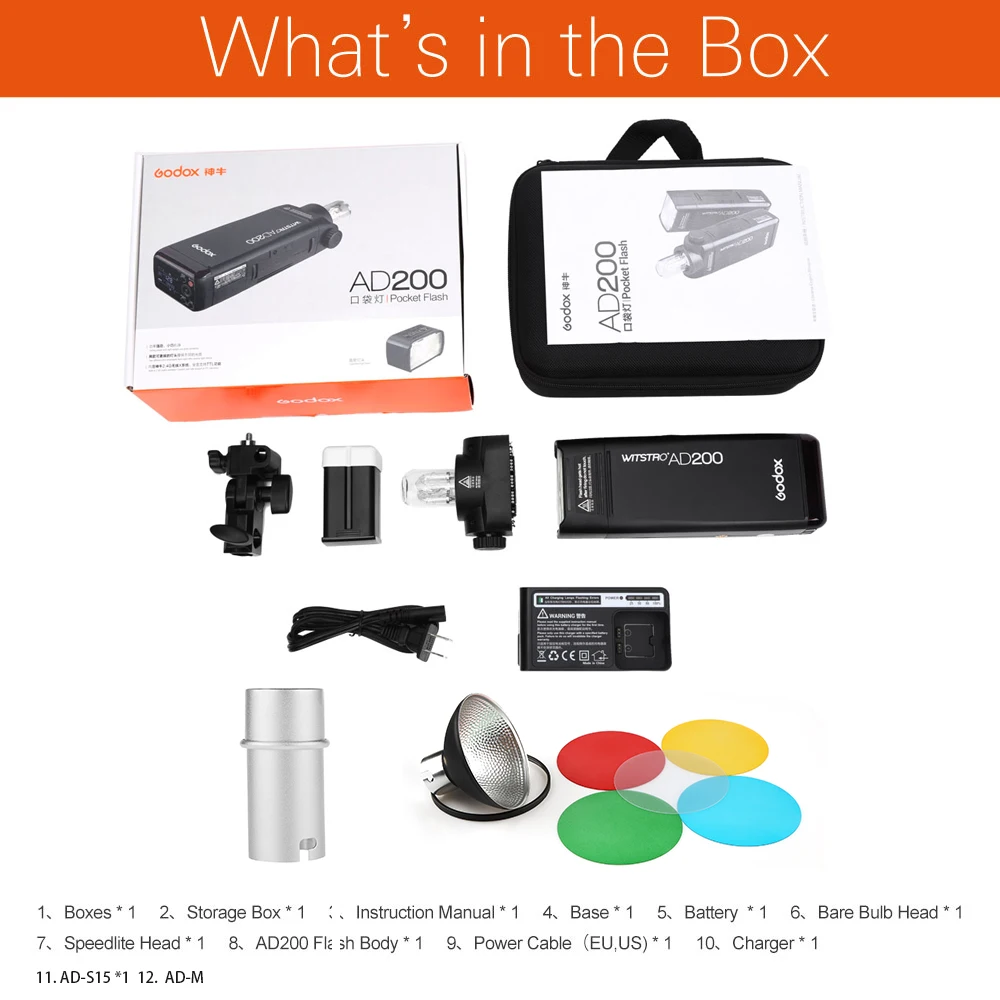 Вссветильник GODOX AD200 TTL 2,4G HSS 18000s с двойной головкой 2900 Вт и литиевой батареей мАч со стандартным отражателем AD-M