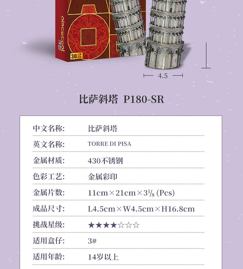 Технические характеристики:Бренд: PiececoolНазвание: Торре-ди-писа3D комплекты металлических моделей