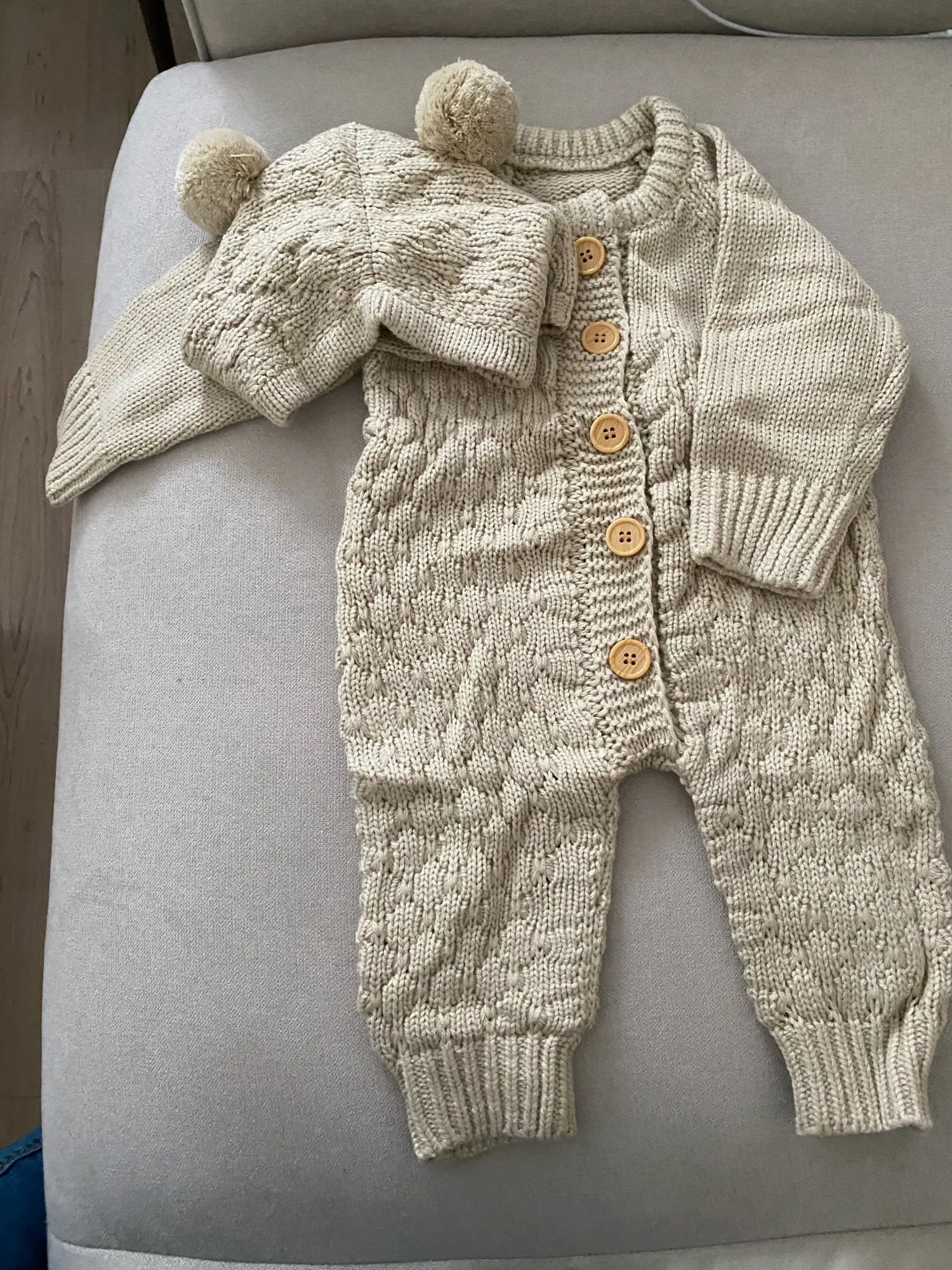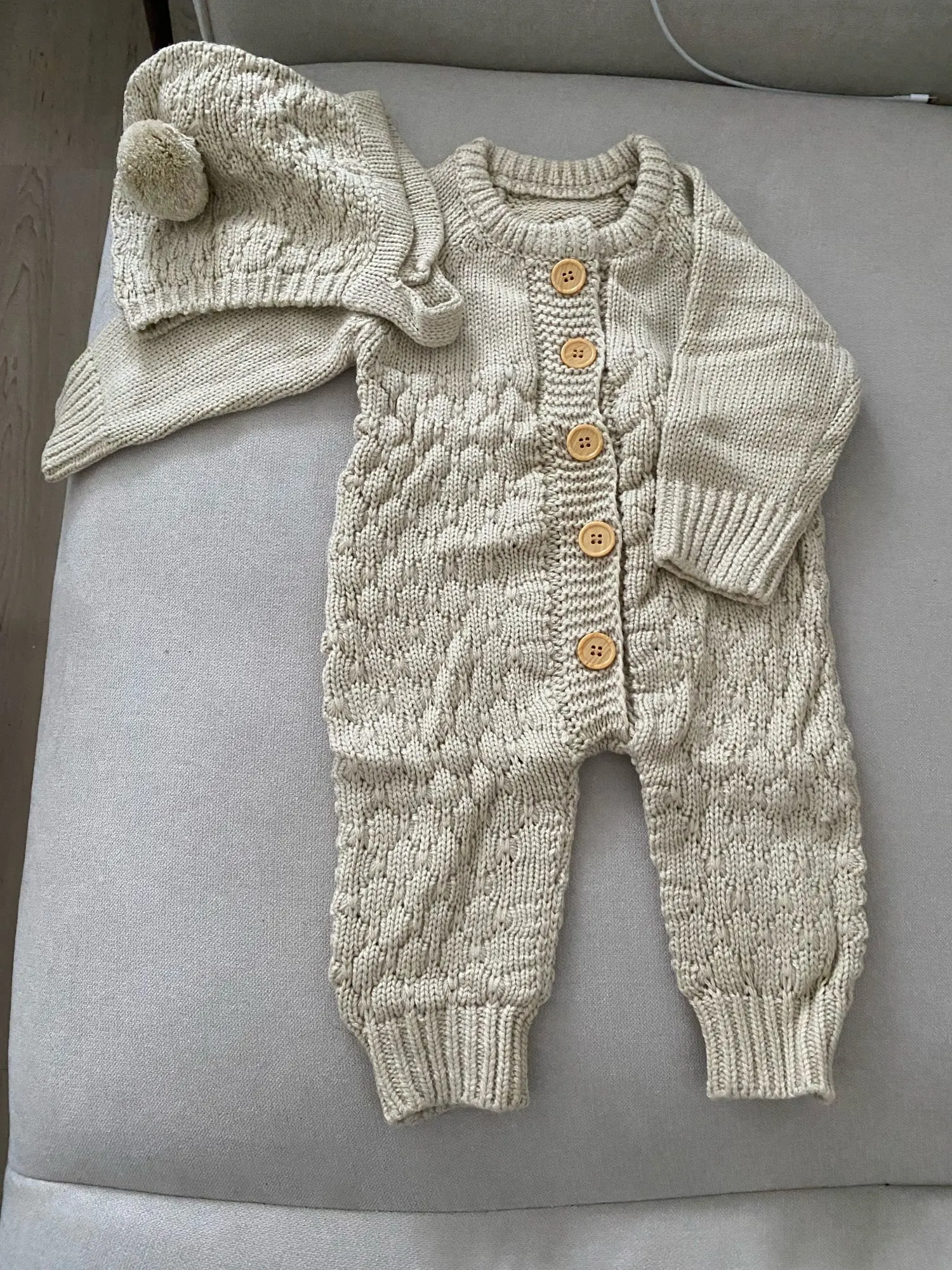 Комбинезон + шапка для новорожденных девочек и мальчиков, Хлопковый вязаный свитер, комбинезон, зимняя одежда для малышей от 0 до 18 месяцев, 2 шт.