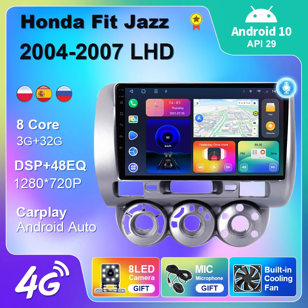 Автомагнитола для Honda Fit Jazz 2004-2007, 2 din, 4G, Wi-Fi, мультимедийный плеер, навигация, автомобильный Android, Carplay, RDS, Android 10, без DVD