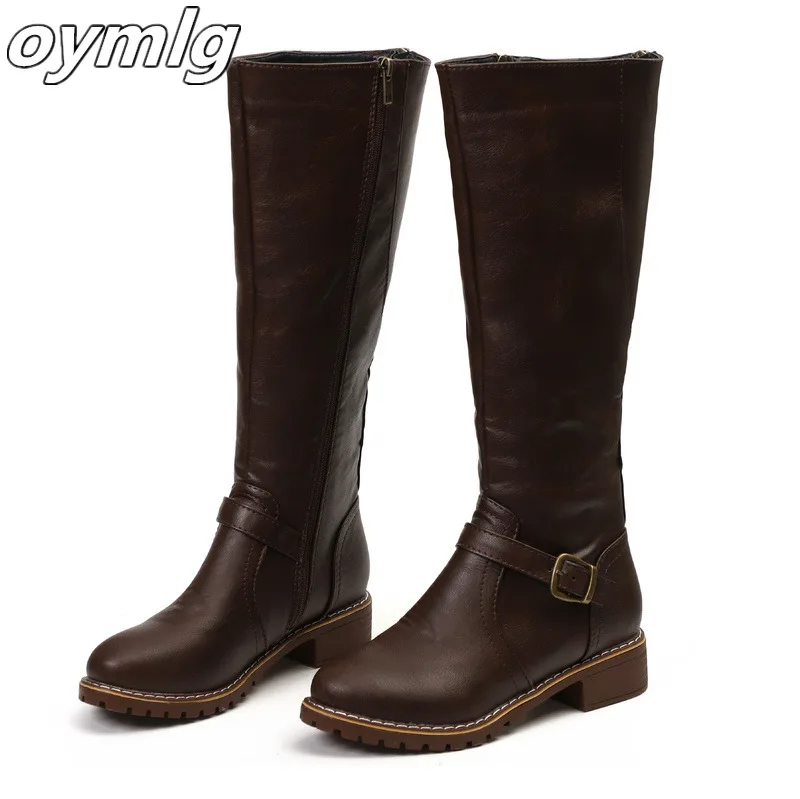 Женские сапоги до бедра, коричневые винтажные кожаные сапоги до колена на квадратном каблуке, на молнии, с пряжкой, сохраняющие тепло, с круглым носком, в британском стиле
