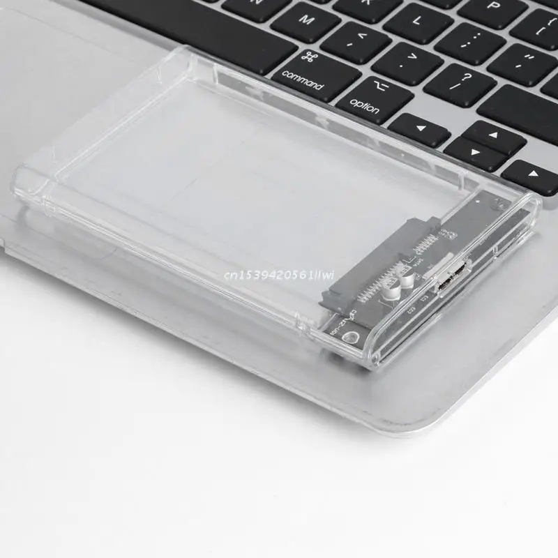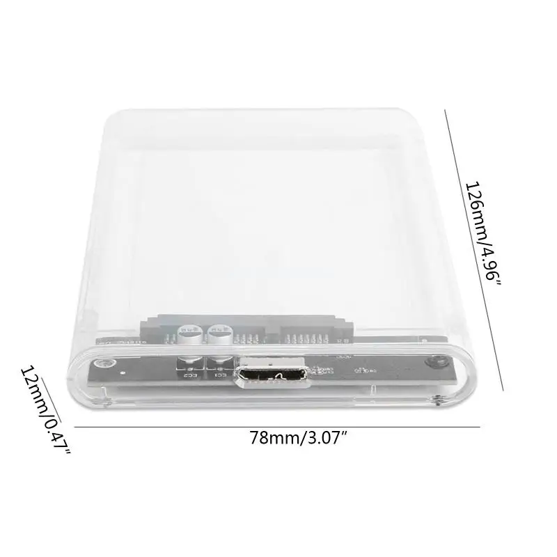 Transparent 2.5" HDD Enclosure SATA to USB3 Portable Clear Hard Drive Disk SSD Supports UASP SATA III Tool-Free Design DropshipOOTDTY 100% brand new and high qualityFeatures:1. Plug & Play, Hot-Swap supported. Tool-free design, once open the box it's ready to be install.2. Compatible with 2.5" SATA hard drives. Optimized for SSD, Supports UASP SATA III.3. Enclosure made by high quality PC transparent board, the whole enclosure looks very clear, the transparent design can help you easily distinguish the hard disk without connecting the computer, also give you a all-round view when drive working.4. The theoretical transmission speed is as high as 6GB / sec.5. Suitable for all 7mm / 9.5mm 2.5-inch SATA 1/2/3 HDD or SSD.6. Suitable for memory expansion of notebook computers; film, image and media processing, data exchange between business, education and home computers; fast and easy data backup.Specifications:Material: ABS+PCSupport Size: 6TBTheoretical transmission speed: 6GB/sCompatibility: 7mm / 9.5mm 2.5-inch SATA 1/2/3 HDD or SSDSize: 12.6 x 7.8 x 1.2cm / 4.9 x 3.1 x 0.5inchesPort information: SATA to USB3Color: TransparentNote:No retail package.Please allow 0-1cm error due to manual measurement. Please make sure you do not mind before you bid.Due to the difference between different monitors, the picture may not reflect the actual color of the item. Thank you!Package includes:1 x External Drive Enclosure(other accessories demo in the picture is not included!)