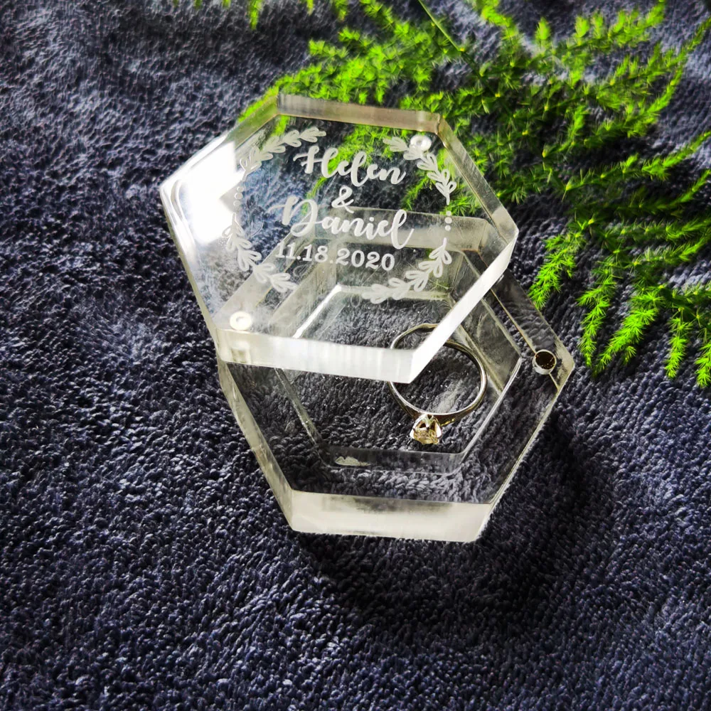 Прозрачная акриловая коробка для колец с именем на заказ, шестигранный держатель для ювелирных изделий, подарок на свадьбу, помолвку, годовщину, романтический подарок