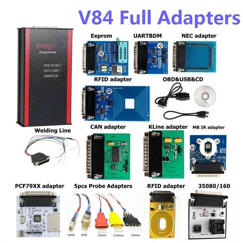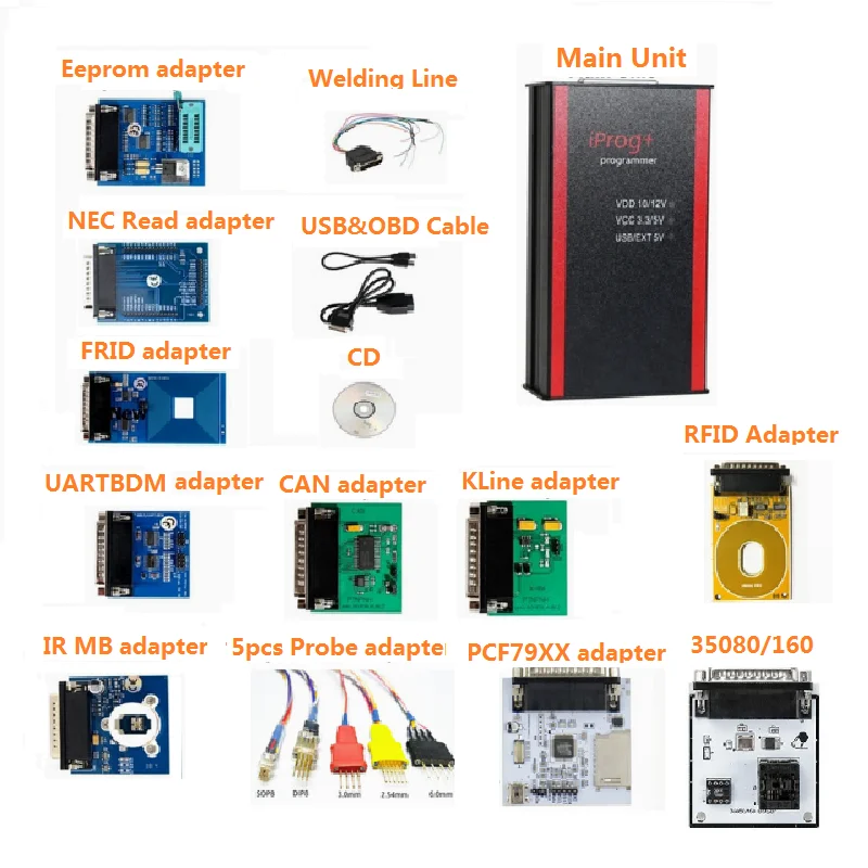 IProg + посылка программиста: 1 шт. x iprog + Основной блок 1 шт. x RFID 125 + 134 адаптер 1 шт. х адаптер Eeprom 1 шт. x адаптер UARTBDM Адаптер для чтения NEC-1 шт. 1 шт. кабель OBD 1 шт. x USB 1 шт. x CD