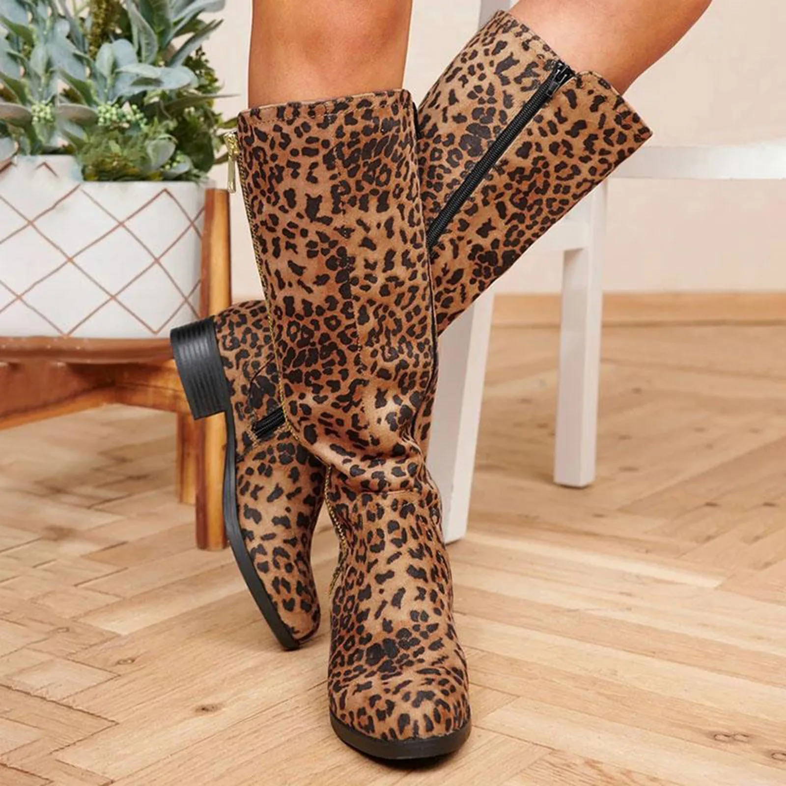 Высокие сапоги на низком каблуке с леопардовым принтом; Модные пикантные Женские ботинки с боковой молнией; Мотоциклетные ботинки; 2021