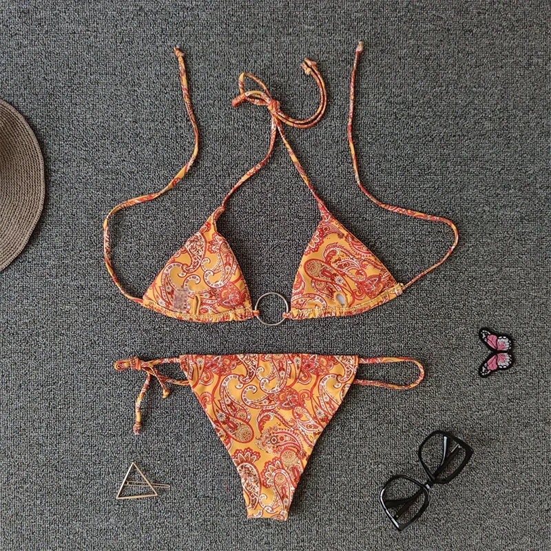 2021 сексуальный треугольный микро бикини набор с цветочным принтом женский купальник с завязками на шее купальник женский с низкой талией купальный костюм Пляжная одежда