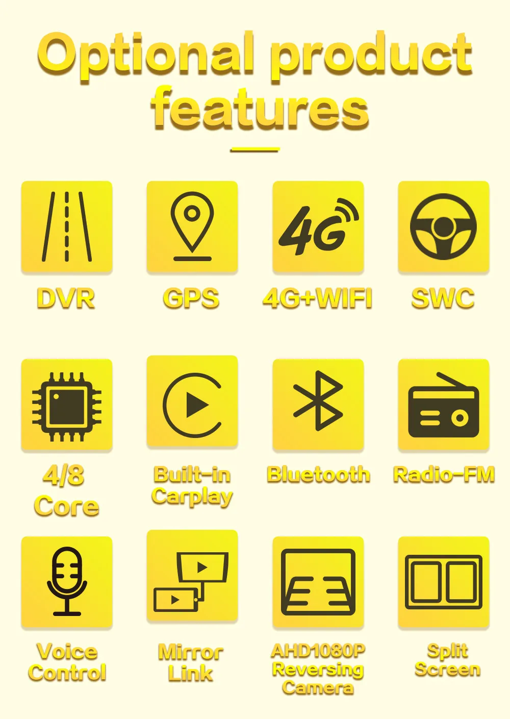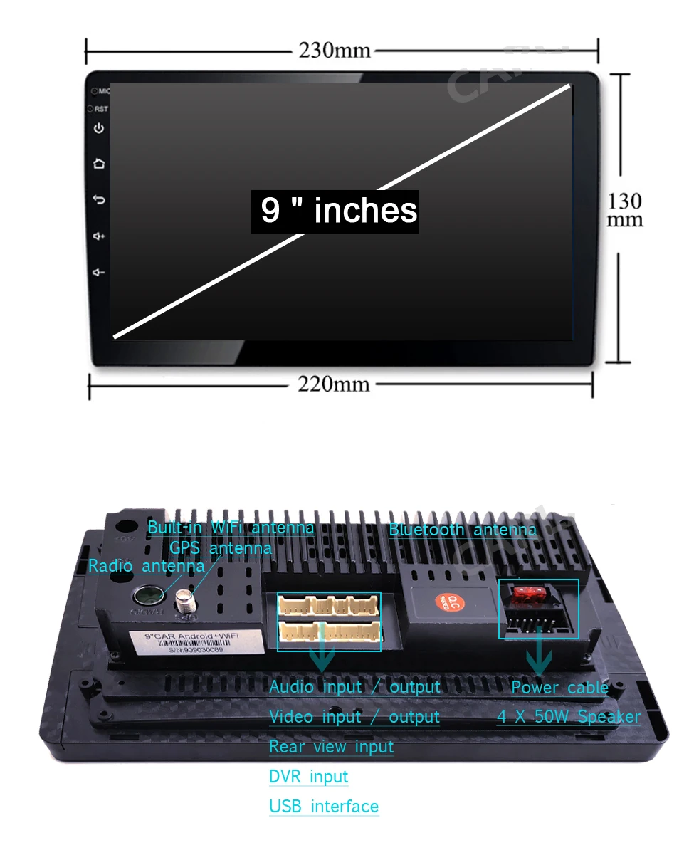 1. RAM: 1G/2G2. ПЗУ: 32G/64G/128G4. Операционная система: Android 10,0/8,15. Разрешение дисплея: 1024X600/1280*7206. Радио: FM7. Дисплей: емкостный экран8. Встроенный DSP/WiFi/GPS/BT/мультимедиа 1080P/USB/SD/AUX9. Поддержка формата камеры заднего вида: AHD 720P/1080P/TVI/CVBS10. Запуск в считанные секунды, быстрая Резервное копирование11. Поддержка зеркального соединения12. Облачная система онлайн обновления (Примечание: в зависимости от локальной сети)