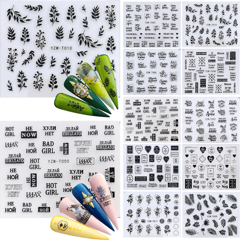 3D наклейки для ногтей, черный, белый цветок, буквы, дизайн, смешанные фотообои, переводные наклейки для ногтей, искусство