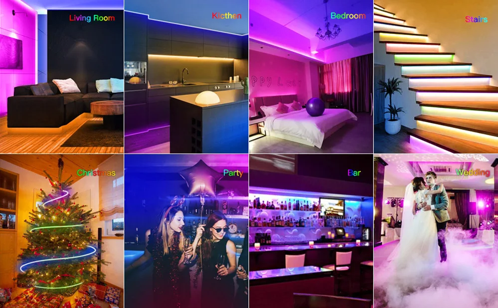 【Синхронизация светодиодных полосок 】 с помощью смарт-приложения, световые полосы могут автоматически включаться и выключаться через заданное время. 14 вариантов динамических режимов, доступных для вас, чтобы вы могли выбрать цвет, который вам нравится.
