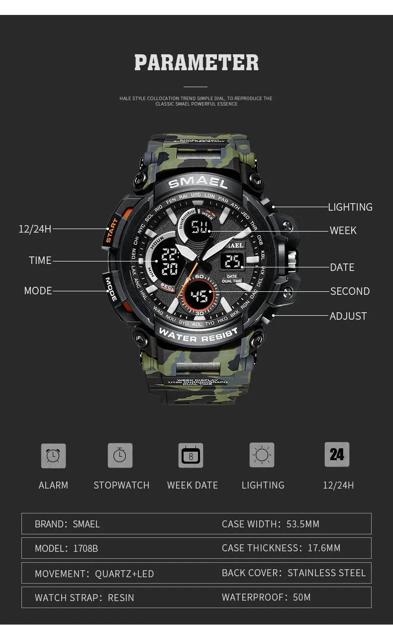 SMAEL спортивные часы водонепроницаемые мужские часы светодиодный цифровые часы Военные мужские часы Relogio Masculino erkek kol saati 1708B мужские часы