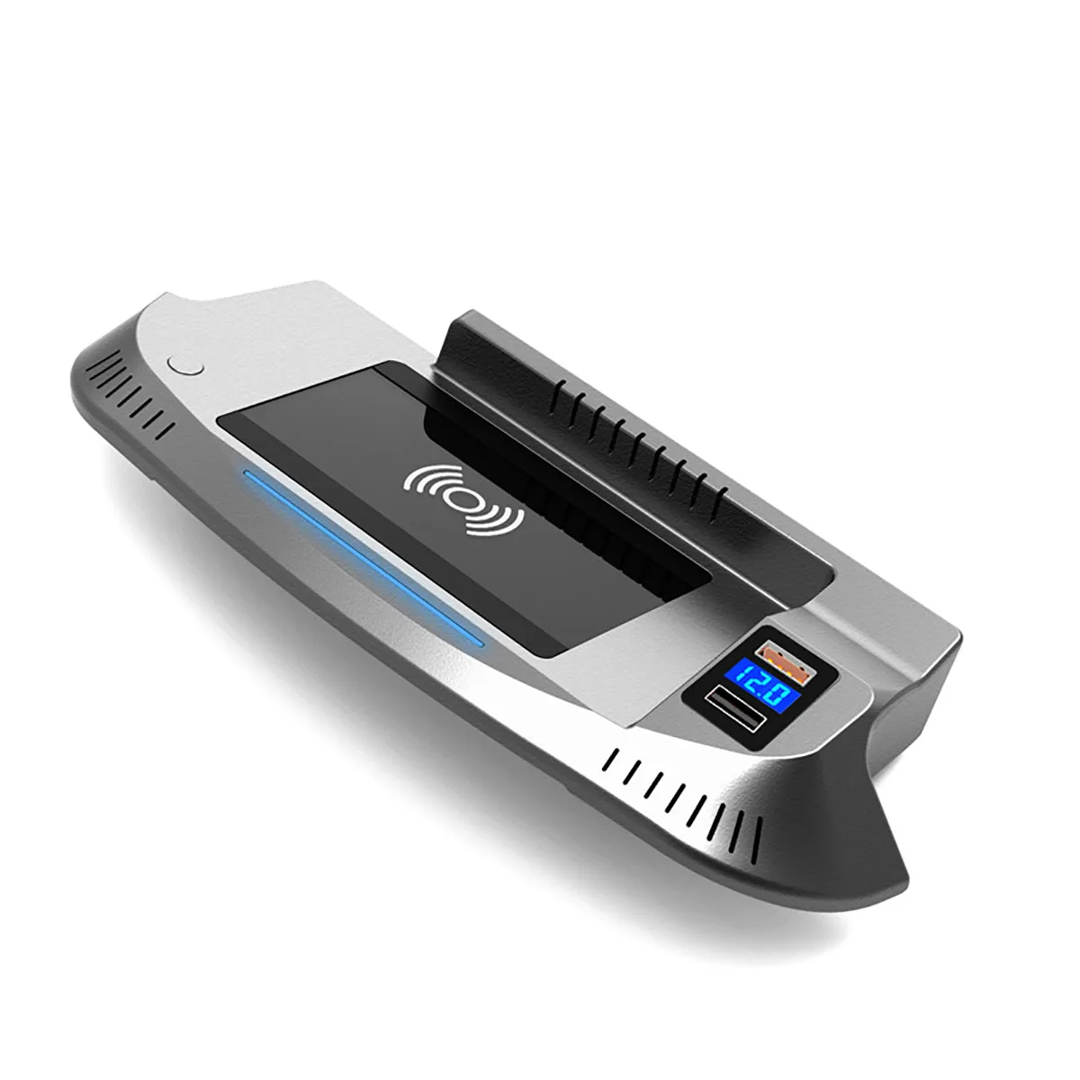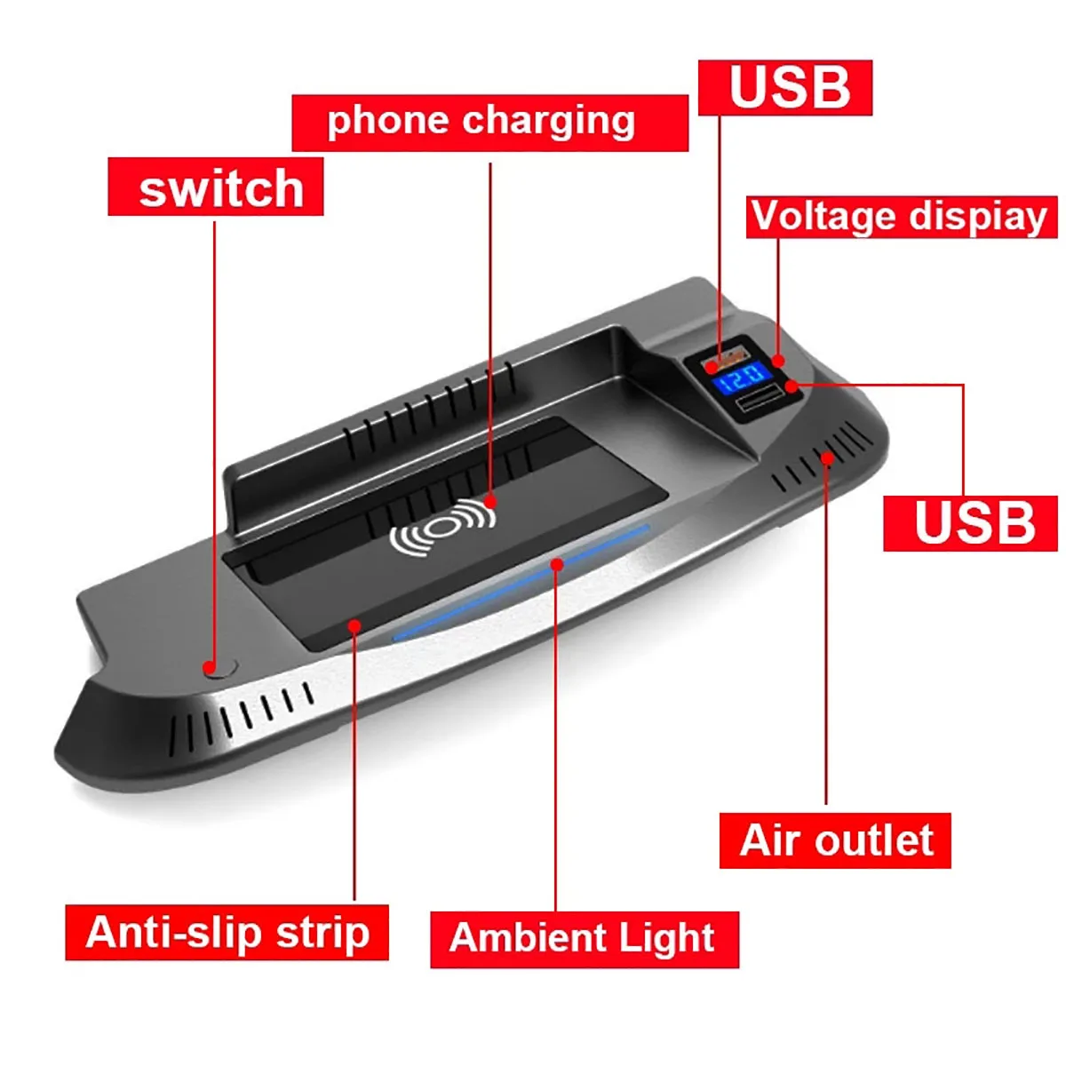 Особенности:-Встроенный бесшумный турбо-вентилятор, конструкция контроля температуры рассеивания тепла, мобильный телефон не нагревается.-Беспроводная зарядка Qi и Быстрая зарядка через интерфейс QC3.0/USB, одновременная Прямая зарядка двумя устройствами.-Интеллектуальный чип AI, интегрированный протокол быстрого воздействия.-Защита от перегрузки по току, перенапряжения, контроля температуры, короткого замыкания и других многозарядных устройств, чтобы защитить мобильный телефон от аккумулятора.-Оригинальный Автомобильный режим, идеальная интеграция оригинального салона автомобиля, без проводки, непосредственно вставляется прикуриватель.