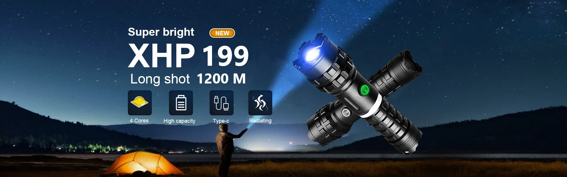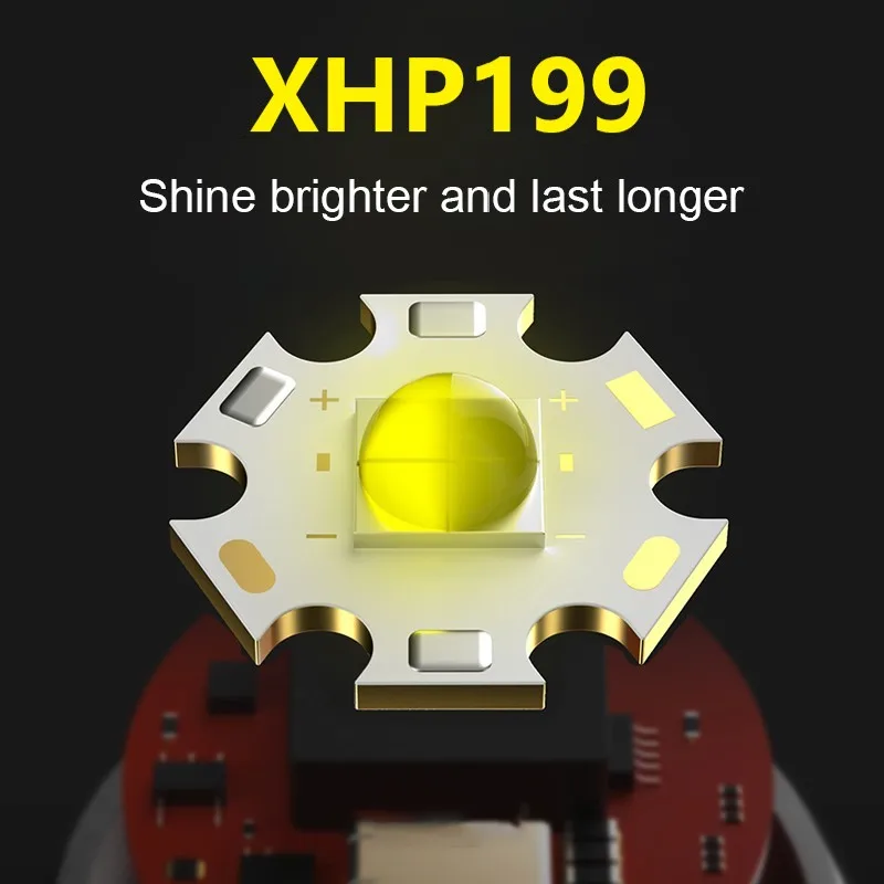 Фонарик использует новейший светодиодный светильник XHP199, а максимальное расстояние облучения может достигать 1200 м. Он идеально решает яркость и использует проблемы со временем старого фонарика, и приносит клиентам лучший опыт. Его можно использовать непрерывно в течение 6-10 часов при одной зарядке. Подходит для ночных занятий, таких как Велоспорт, кемпинг и охота. Это также идеальная наружная фара для ночного чтения, путешествий на открытом воздухе, приключений и спасения.