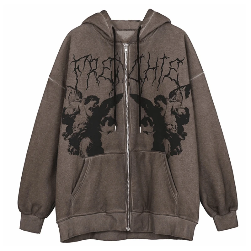 Корейские модные толстовки на молнии, Женская коричневая куртка большого размера с принтом ангела в стиле Харадзюку, Женская толстовка, 2021