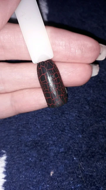 Лак классный, с ним получаются очень интересные эффекты. Сначала попробовала на своем ногтей, на старый топ - эффекта не было. Потом поняла, что лак расползается только на липким слое. Поэтому я наношу базу, цвет и сверху этот лак. Если нанести густо - узор будет крупным, если наносить тонким слоем - будут мелкие трещины. Лак вроде сохнет на воздухе, но я на всякий случай просушиваю в лампе. Очень довольна товаром