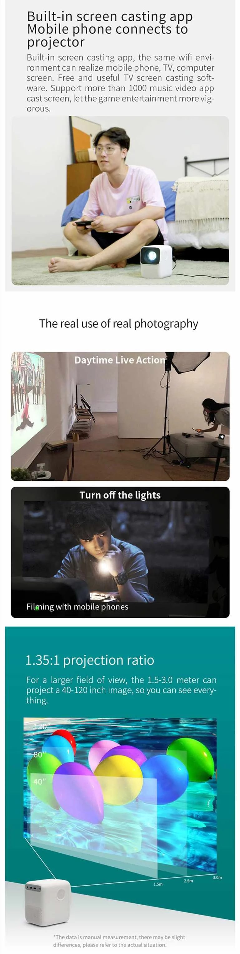 A: Поддержка мобильных телефонов, планшетов, ноутбуков, выключателей, PS4, ТВ-приставок и т. д. для проекции экрана.