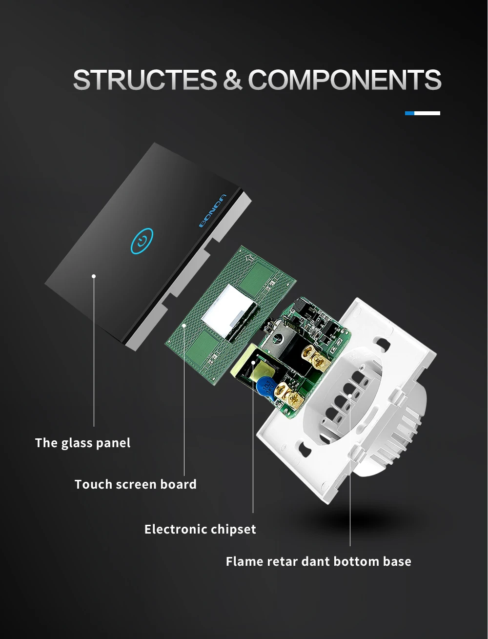 7.Безопасность и сертификация: Настенный выключатель изготовлен из высококачественных материалов, таких как огнестойкая оболочка, Фосфорная бронза соединяет и передовое ПК + закаленное стекло, может обеспечить защиту от огня, перегрузки для защиты вашей семьи.