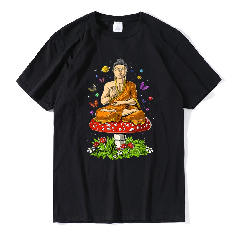 Забавная футболка с Буддой и волшебными грибами, летняя мужская одежда Harajuku, Мужская футболка из 100% хлопка, футболка с короткими рукавами для йоги