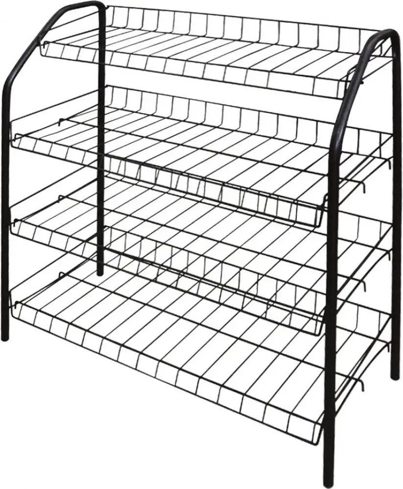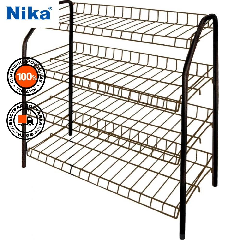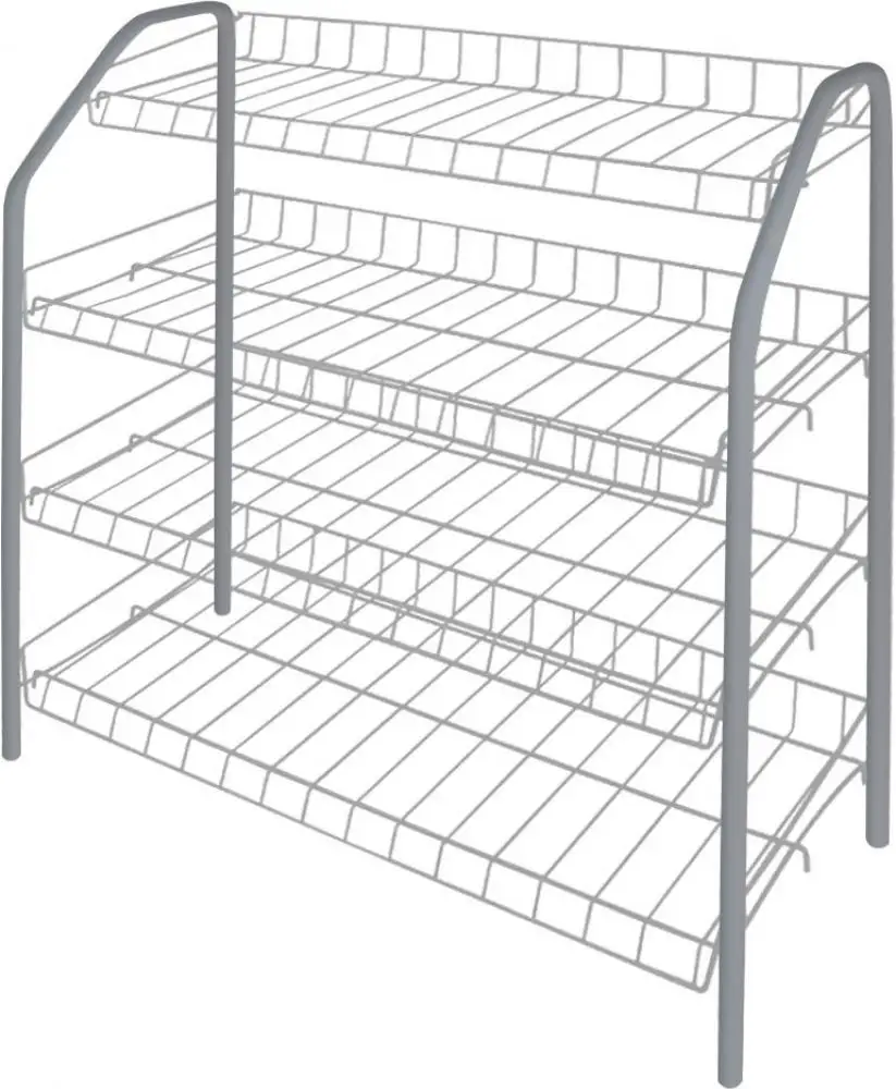 Металлическая подставка для обуви eth1 с четырьмя решетчатыми полками подходит для прихожей и займет очень мало места. Полка удобна и функциональна, она будет компактно размещена 12 пар обуви, которые постоянно используются. Обувь в открытом доступе, все время проветривается, не «загорается» и быстро сохнет после дождя. Устойчивая рама из металлической трубы оснащена пластиковыми наконечниками и не повредит ковер или паркетный пол при перемещении полки.