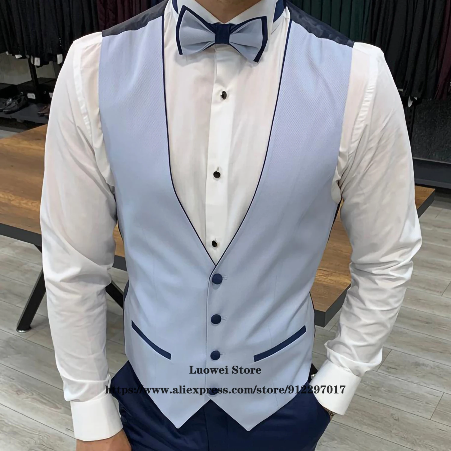 Мужские костюмы, модный светло-синий свадебный смокинг для жениха, мужской облегающий комплект из 3 предметов, официальный деловой блейзер с заостренным лацканом (пиджак + брюки)