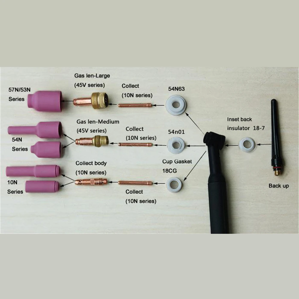 Этот комплект подходит для всех факелов с воздушным охлаждением серии 17 и 26 и факелов с водяным охлаждением серии 18,Включая Lincoln PTA-17, PTA-18 и PTA-26 факелами,Miller Diamondback DB17, DB18 и DB 26 факелов,Наряду со сварочным ремеслом WP-17, WP-18 и WP-26 факелами.