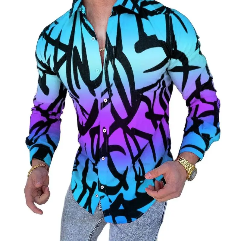 Рубашка мужская с длинным рукавом, Повседневная блуза с принтом, уд...
