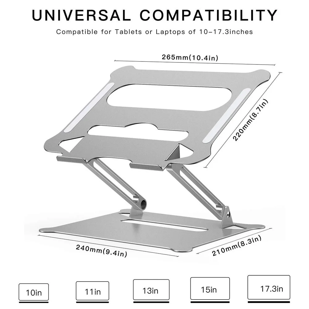 Ультратонкая Складная регулируемая подставка для ноутбука с 8 углами, эргономичный угол подъема защищает шейный отдел позвоночника и здоровье глаз.Алюминиевый сплав прочный, несколько силиконов обеспечивают лучшую защиту для вашего оборудования, специальный дизайн rEserve компьютерный кабель полый для удобного хранения.Подходит для ноутбука 11-17 дюймов. Лучший выбор для повседневной работы и деловой поездки.