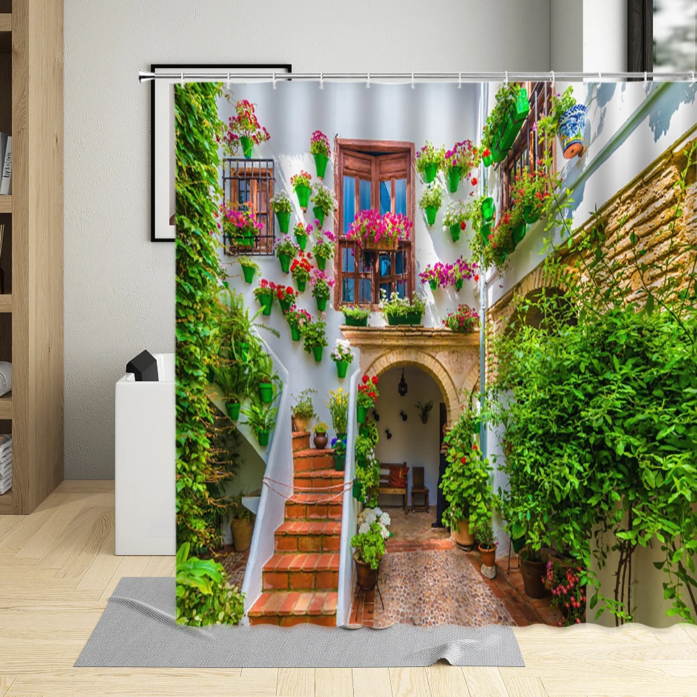 Занавеска для душа с изображением греческого города, улицы, цветов,...