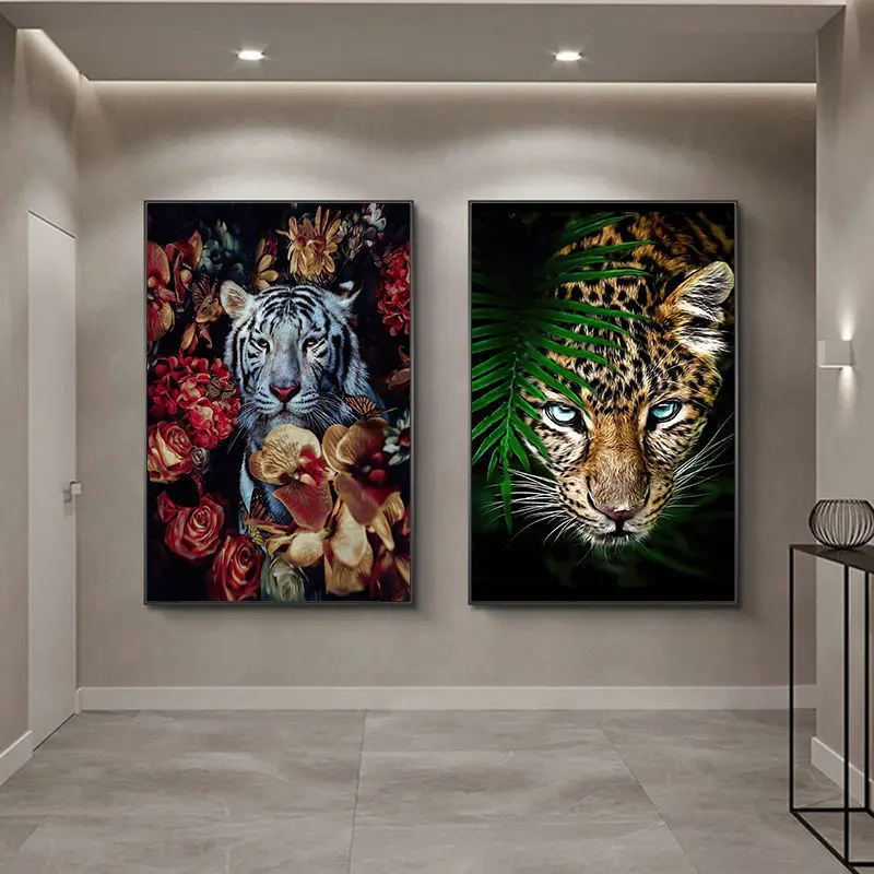 Тигр и леопард, прятки в цветах, Картина на холсте, плакаты и принты, настенные художественные картины для гостиной, украшение для дома
