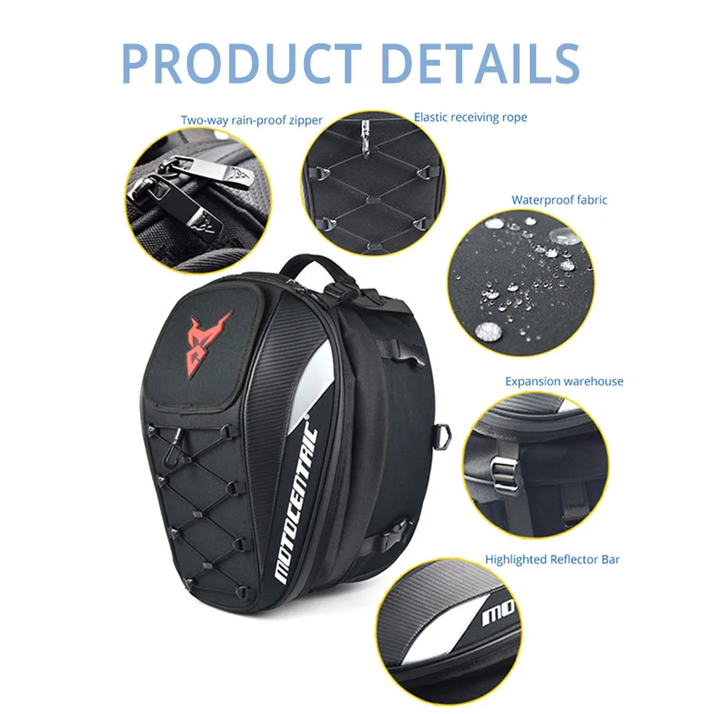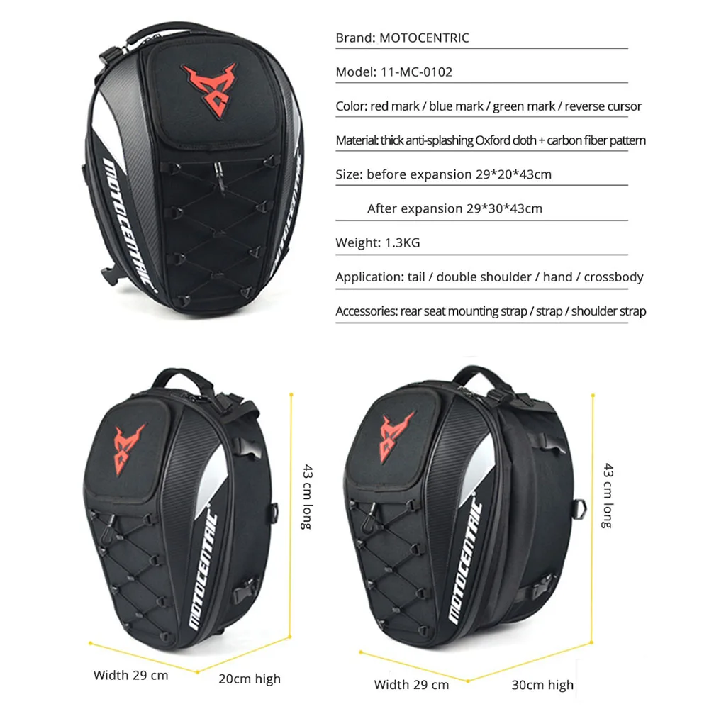 Specifiction :Model: 11-MC-0102Color: Red, Blue, Green, ReflectiveMaterial: thickened water repellent Oxford cloth + carbon fiber patternSize (approx.):Before : 29*20*43cm/11.42*7.87*16.93inch.After: 29*30*43/11.42*11.81*16.93inch.Weight: About 1.3KGAccessories: Backseat installation belt, strap, shoulder strap