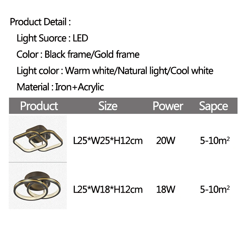 1. Название: современный светодиодный светильник2. Цвет корпуса: Золотая оправа/черная оправа3. Размер: Square-L25 * W25 * h12 см, мощность: 20 Вт, площадь: 5-10 м2Round-L25 * W18 * h12 см, Мощность: 18 Вт, площадь: 5-10 м24. Материал: металлический корпус лампы, акриловый абажур5. Применение: гостиная, спальня, столовая, проход, коридор6. Стиль: простой светодиодный потолочный светильник7. Тип: современные домашние осветительные приборы8. Светильник с цветовой температурой: холодный белый/3 цвета9. Доставка из Китая10. Гарантия: один год11. Вход: AC 110V 220V