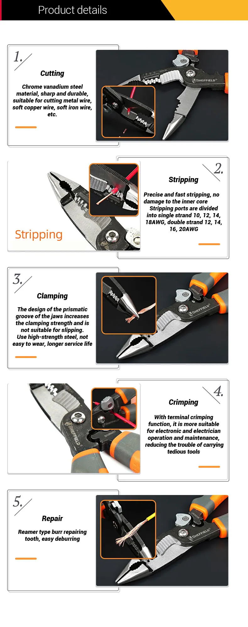 Многофункциональный инструмент SHEFFIELD 5 в 1, игольчатые плоскогубцы для электрика, кусачки для зачистки проводов, обжимные плоскогубцы S035057
