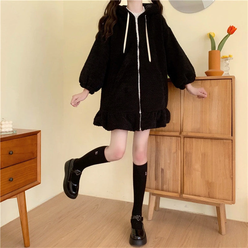 Толстовка Женская однотонная на молнии, милый мешковатый теплый Мешковатый свитшот с длинными рукавами-фонариками, с капюшоном и кроличьими ушками в стиле "Лолита", стиль Харадзюку, большие размеры