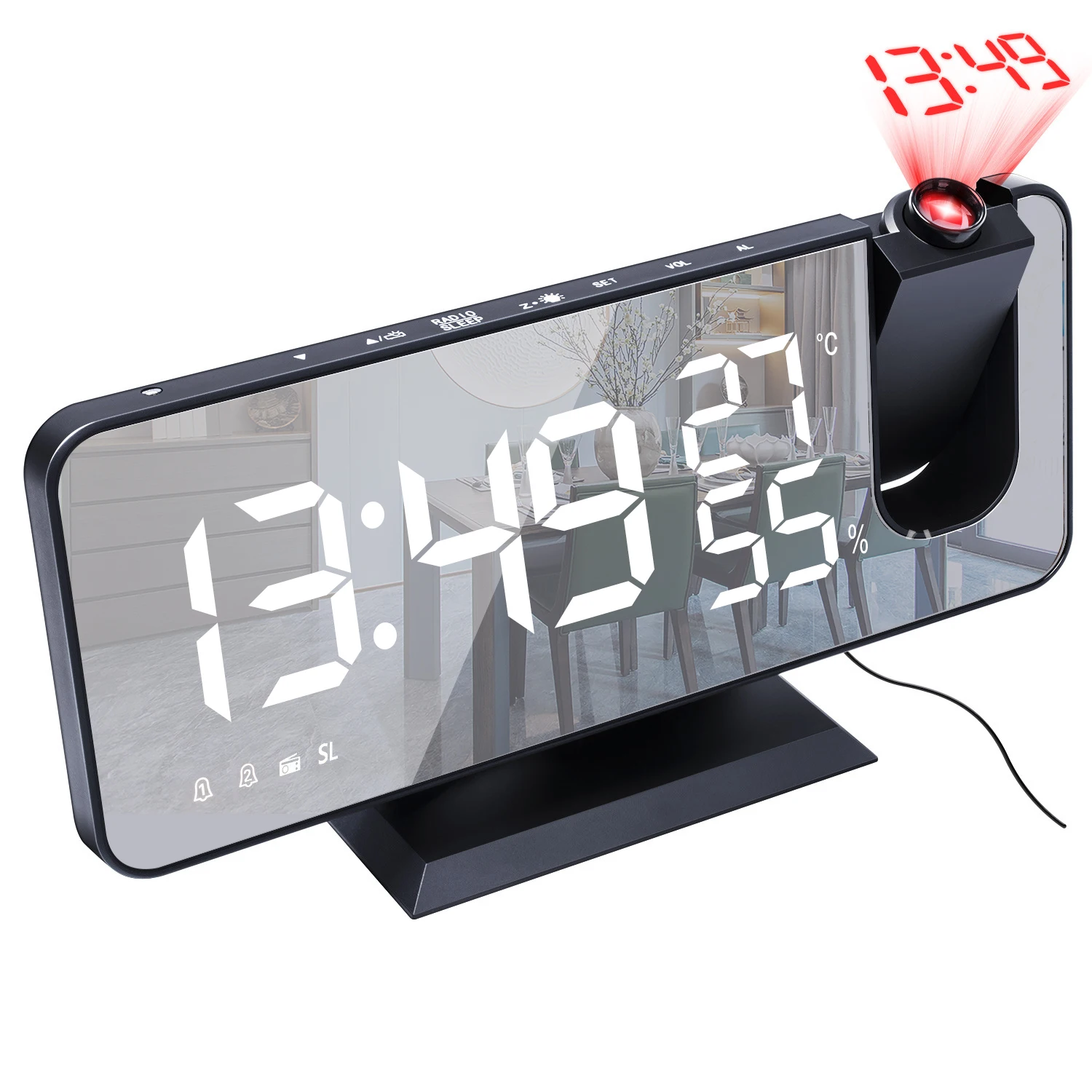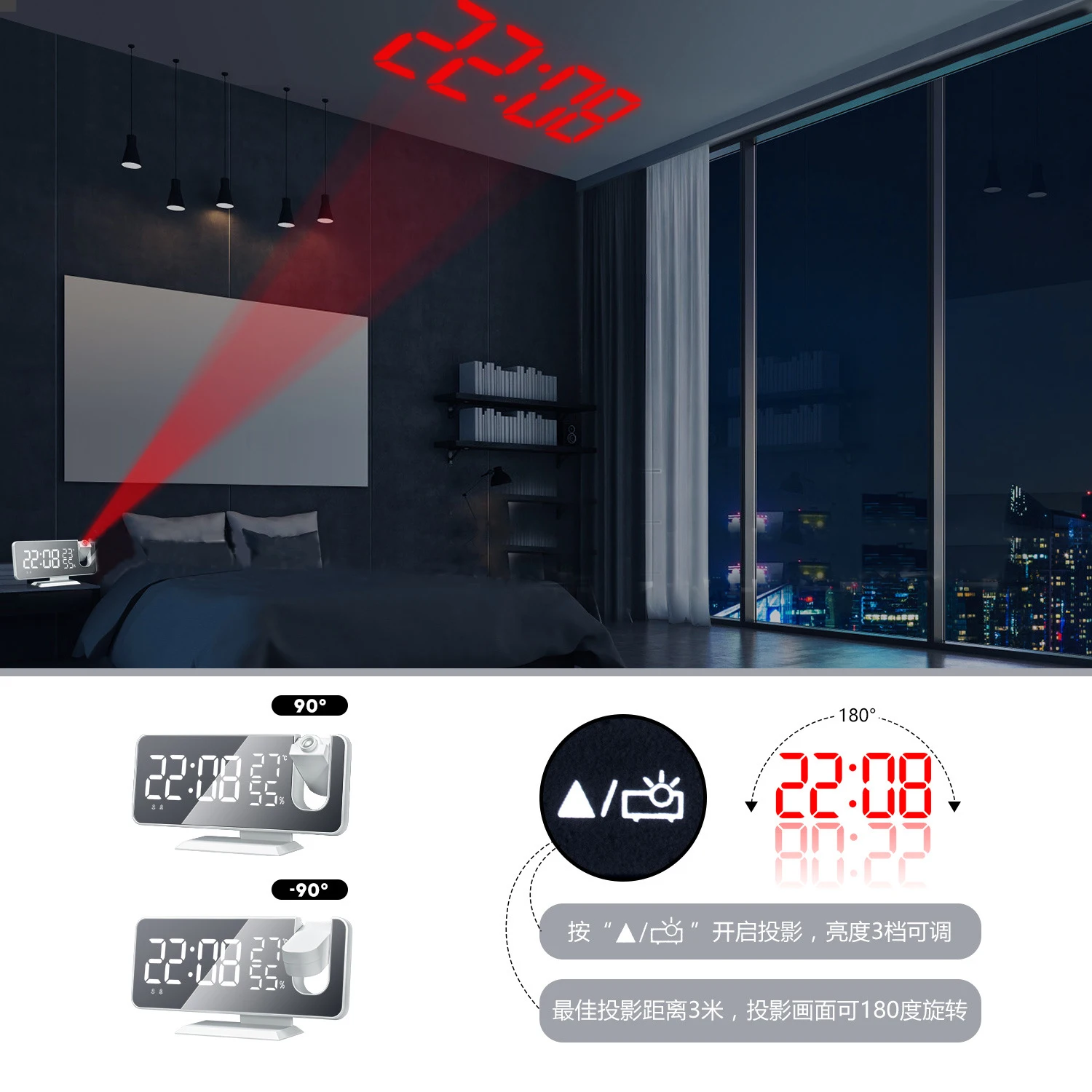 Особенности:Большие светодиоды отображают время, температуру легко и удобно для чтения.Функция проекции: время проекции, регулируемый фокус, 3-уровневая яркость проекции, может вращаться проекция на 180 °.Автоматическая регулировка светильник: в этом режиме яркость проекции не может регулироваться автоматически в соответствии с яркостью inddor.Функция FM-радио: Ручной FM, можно установить время прослушивания, станция автоматического поиска.Функция двойного будильника: 2 будильника можно установить на любую дату по отдельности, а также установить режим повтора сигнала.Функция термометра в помещении: Отображение температуры в реальном времени, режимы 12 ч/24 ч.4 уровня яркости дисплея можно настроить вручную по мере необходимости.Экран имеет особый ход, который можно использовать как зеркало для макияжа.Встроенная функция отключения памяти. Характеристики:Материал: АБСВход USB: 5 В постоянного токаЦвет светильник: синий, белыйЧастота FM: 87,5-108 МГцПроекционное расстояние: 0,5-5 мРегулировка громкости: 0-15 уровнейЧасовой формат: 12 ч/24 чРегулировка яркости: 4 уровняБатареи: 1 * CR2032 (в комплекте) или 5 в постоянного тока Комплектация:1 * проекционные часы1 * CR20321 * USB кабель1 * Руководство пользователя