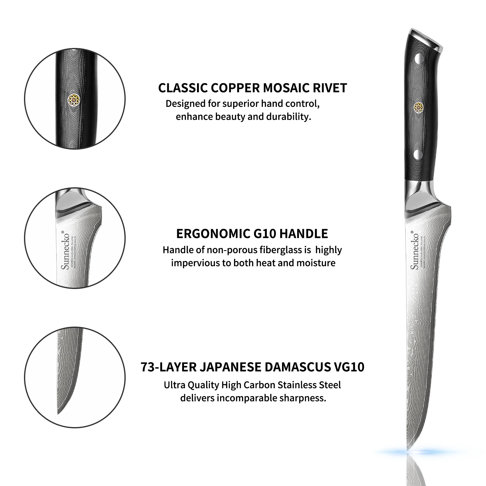2. Премиум японская сталь-бритва острые лезвия>Импортный японский VG10 супер Сталь с 73-слой из дамасской стали Сталь-Высокая эластичность и твердость. Наш нож VG10 является антипригарным, имеет изысканный Японский узор "Роза цунами" в Дамаске и является жидким азотным закаленным, обеспечивающим длительную производительность! Пятно и коррозионно-стойкое лезвие. Каждый узор лезвия отличается, уникальность делает его художественным произведением, подходящим для коллекционирования или домашнего использования.