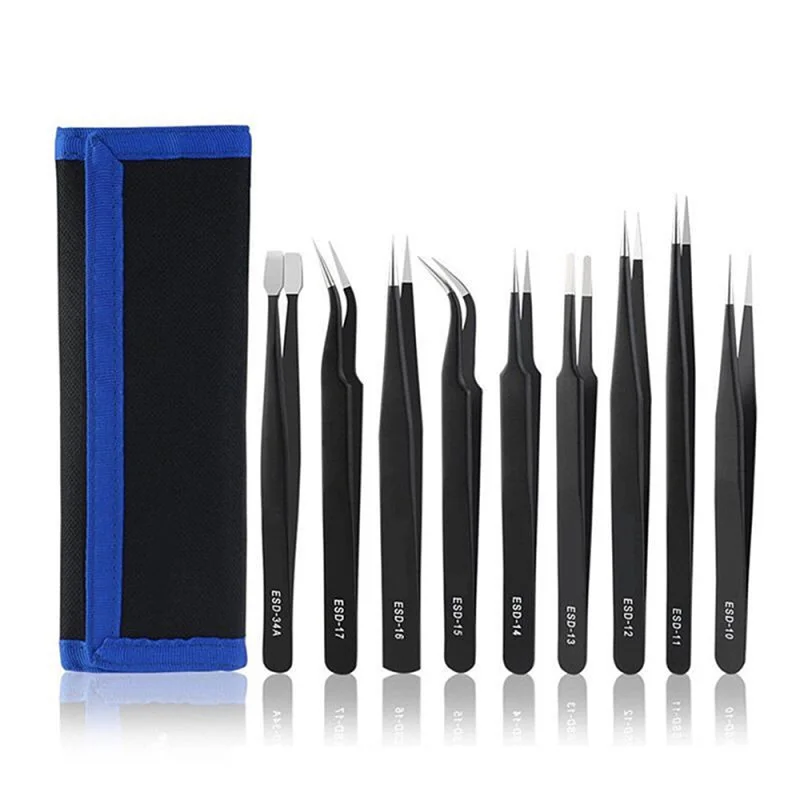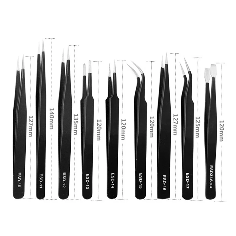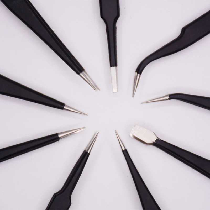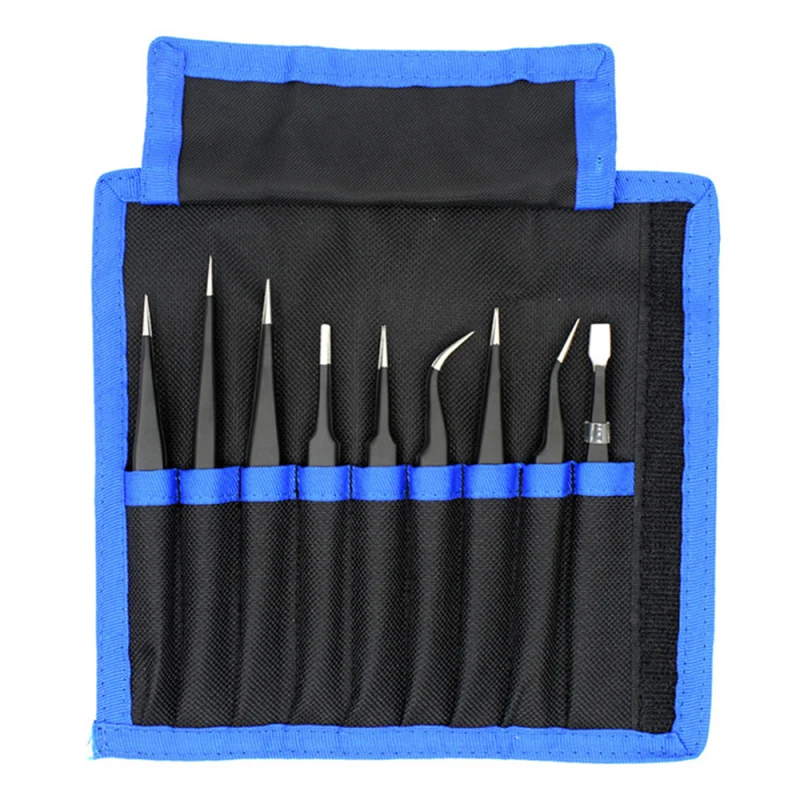Набор антистатических пинцетов, комплект из 9 предметов, из нержавеющей стали с плоской головкой и налокотниками для рукоделия