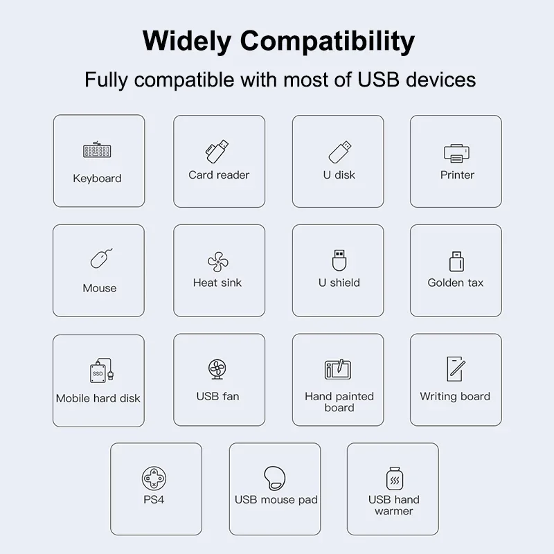 Полностью совместим с большинством usb-устройств, клавиатуры, мыши, u-диска, камеры, usb-гарнитуры, принтера, usb-кабеля, микрофона, игровых автоматов, usb-вентилятора, компьютера, ноутбука и т. д.