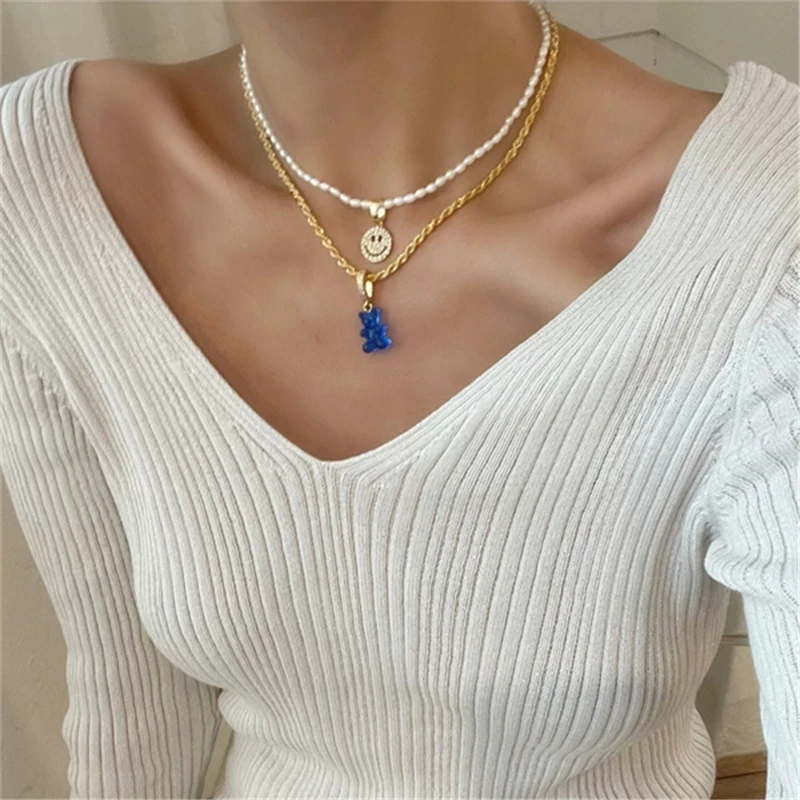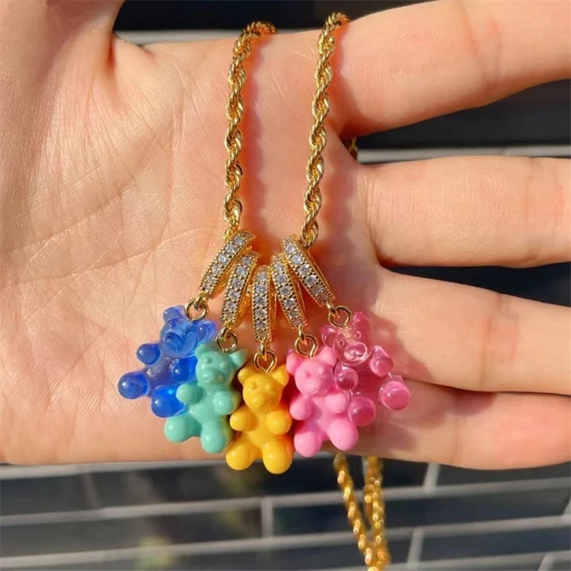 HUANZHI 2021 Новый разноцветный полимерный медведь кулон Цирконий Хрустальный жемчуг цепочка Ожерелье для женщин девушек