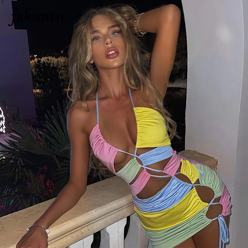 Соблазнительные вечерние платья FAKUNTN для женщин 2021, модное вечернее элегантное женское облегающее мини-платье с контрастной строчкой и кулиской