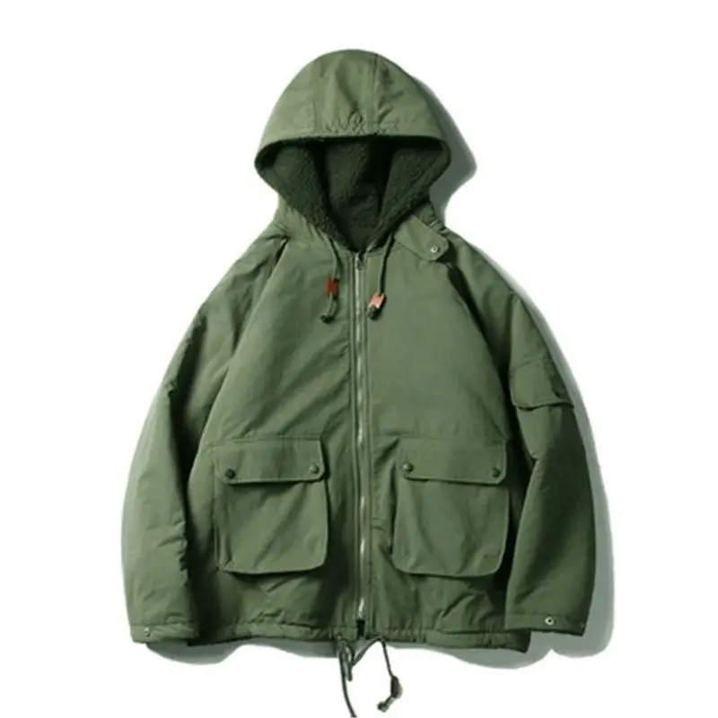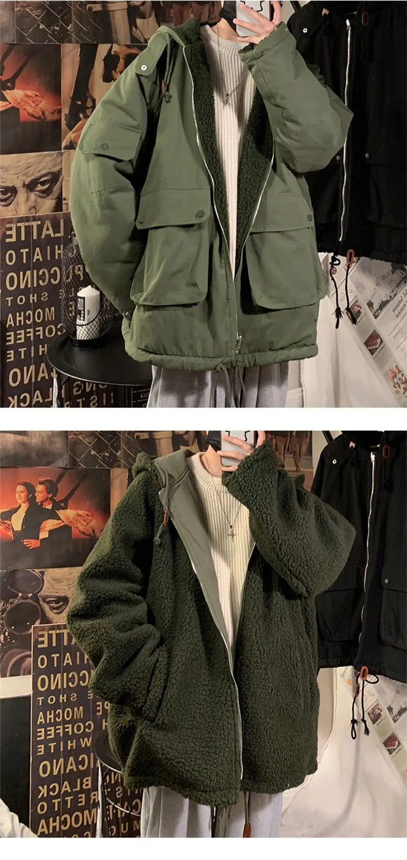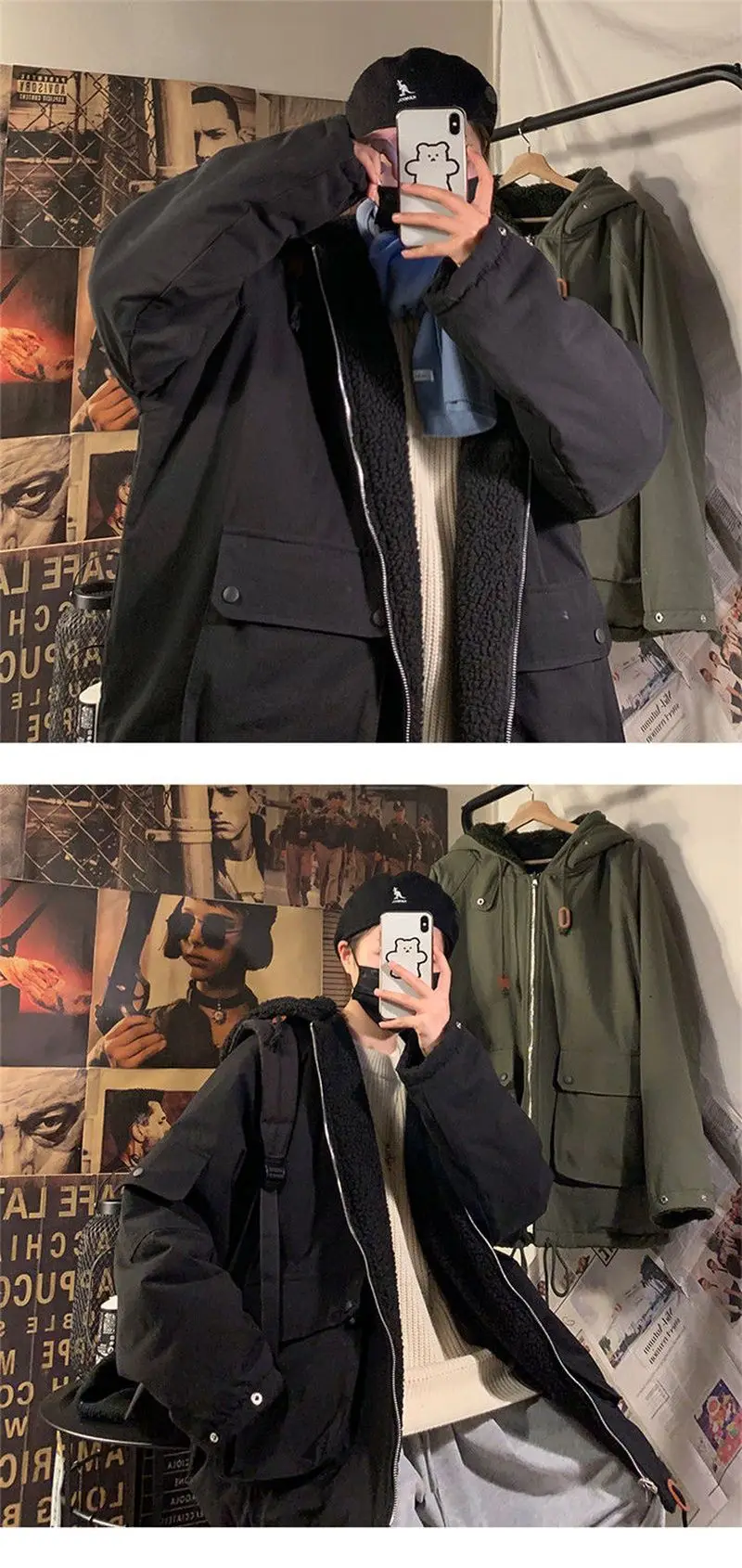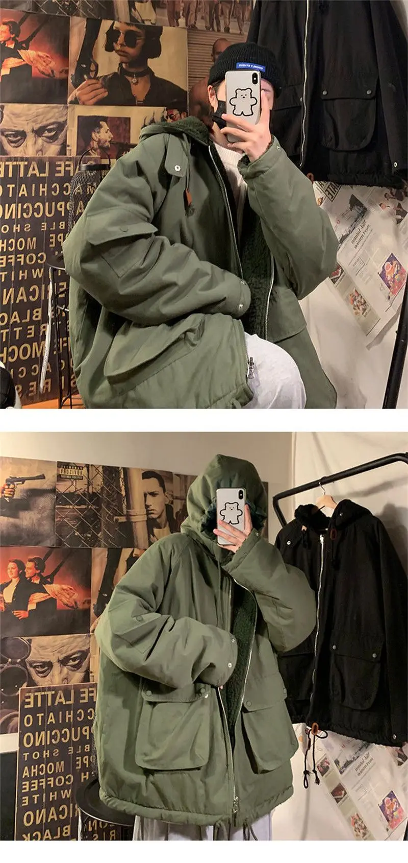 Двусторонняя куртка-карго из хлопка для мужчин и женщин, свободная утепленная куртка армейского зеленого цвета с капюшоном из бархата ягненка, теплая верхняя одежда в Корейском стиле