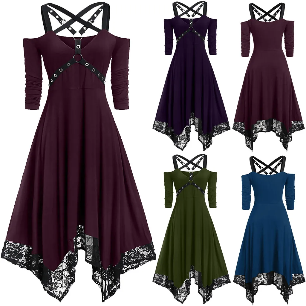 Женское винтажное платье с открытой спиной, кружевное готическое платье трапециевидной формы с открытыми плечами и длинным рукавом, платье для вечеринки на Хэллоуин, 2021